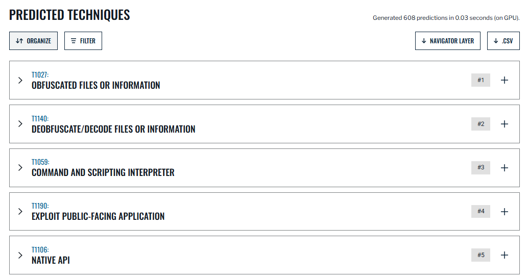 The tool is based on JS, without the need of a backend, everything runs in the user’s browser. Using as input a list of observed techniques. The output is the top inferred techniques, sorted by probability of association.
